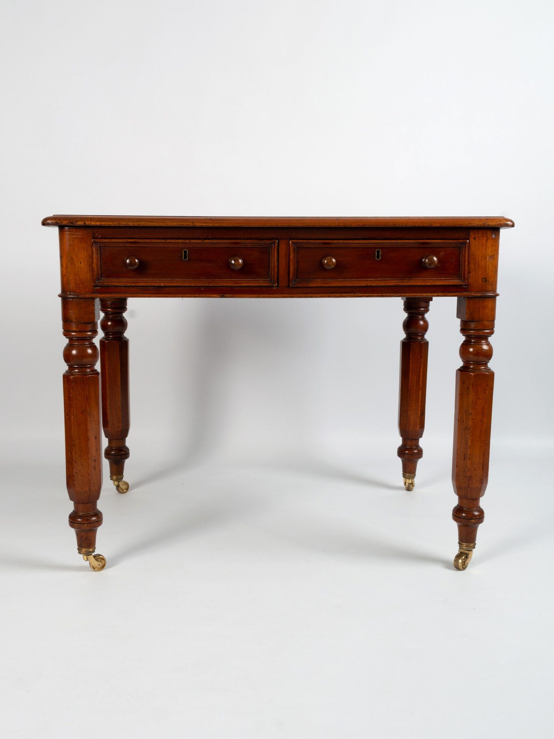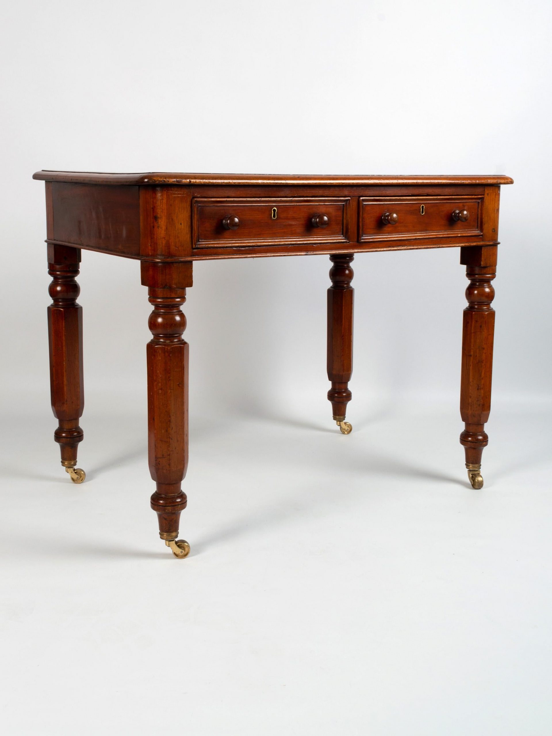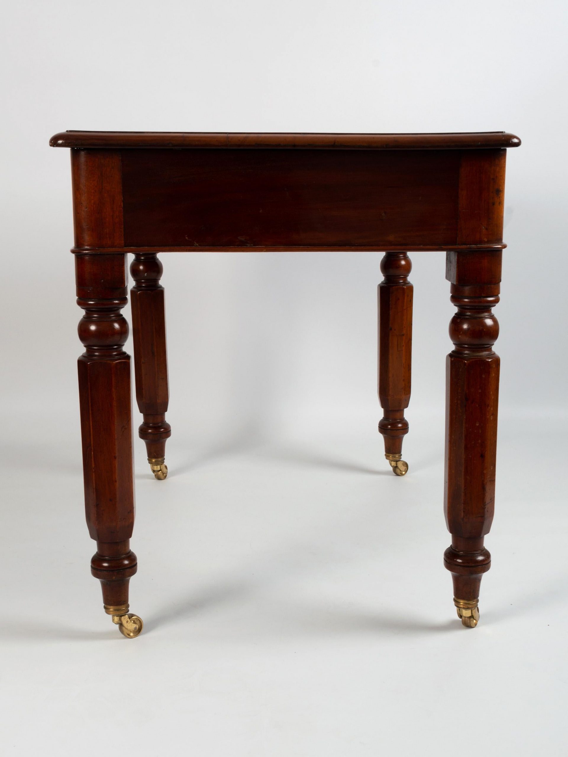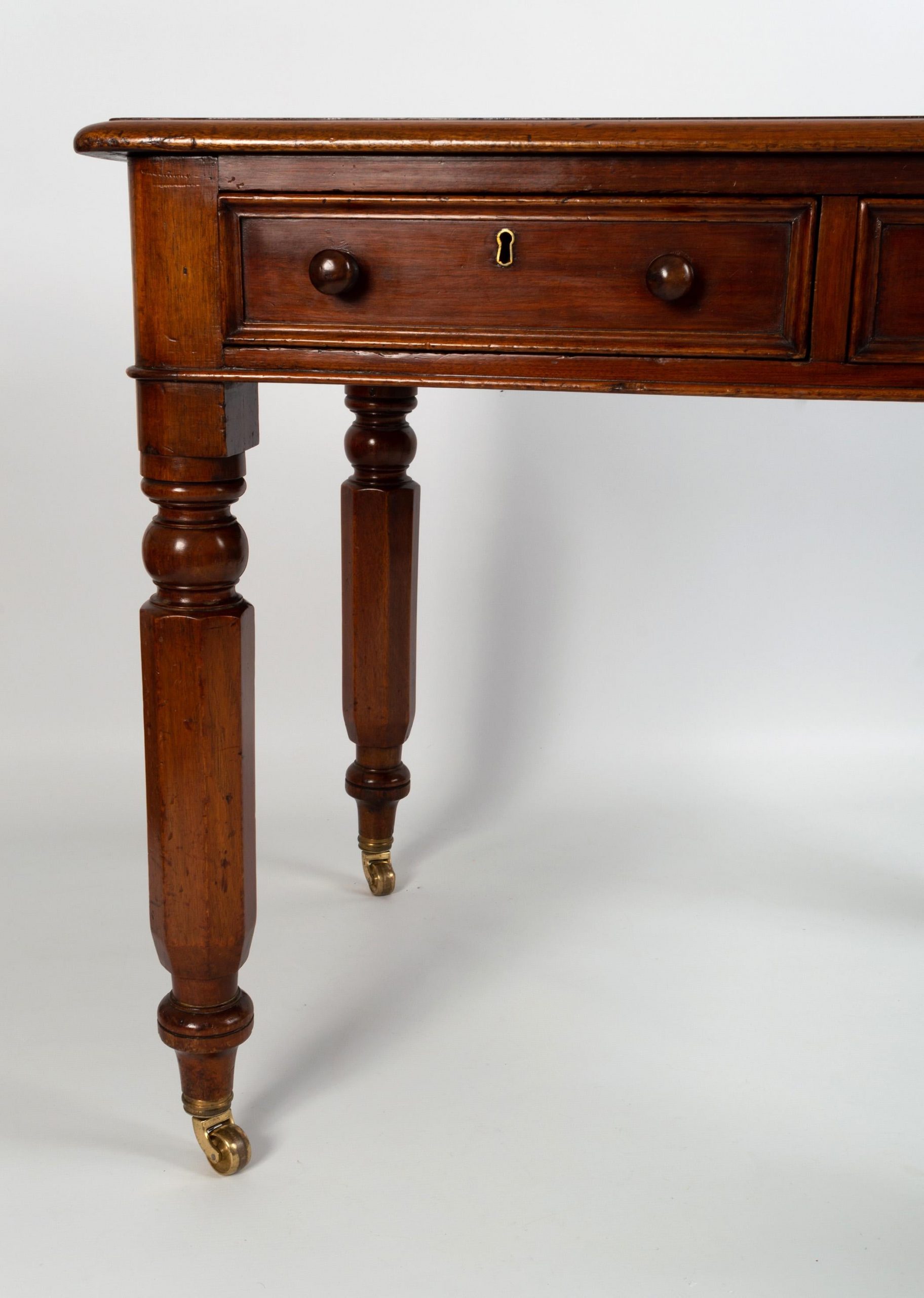 Antique 19th century English Mahogany and leather inset library table C.1840. A neatly proportioned library desk with two drawers, standing on beautifully turned legs, terminating in brass castors. This early Victorian example is presented in excellent condition commensurate of age.