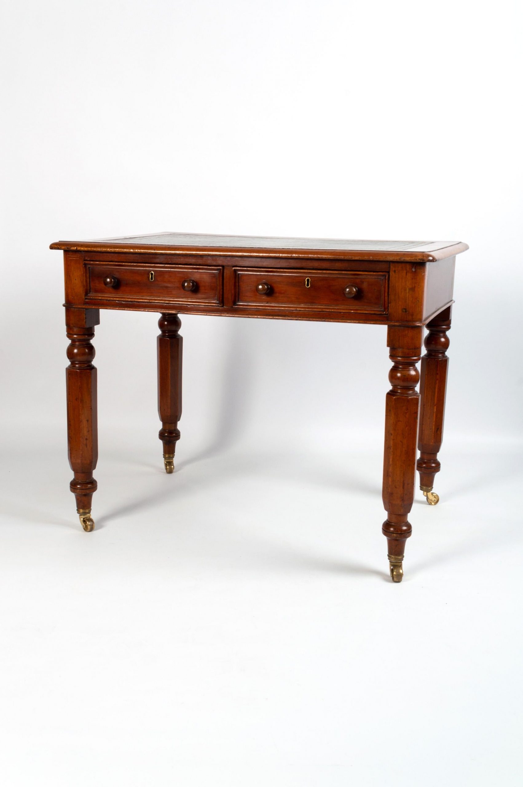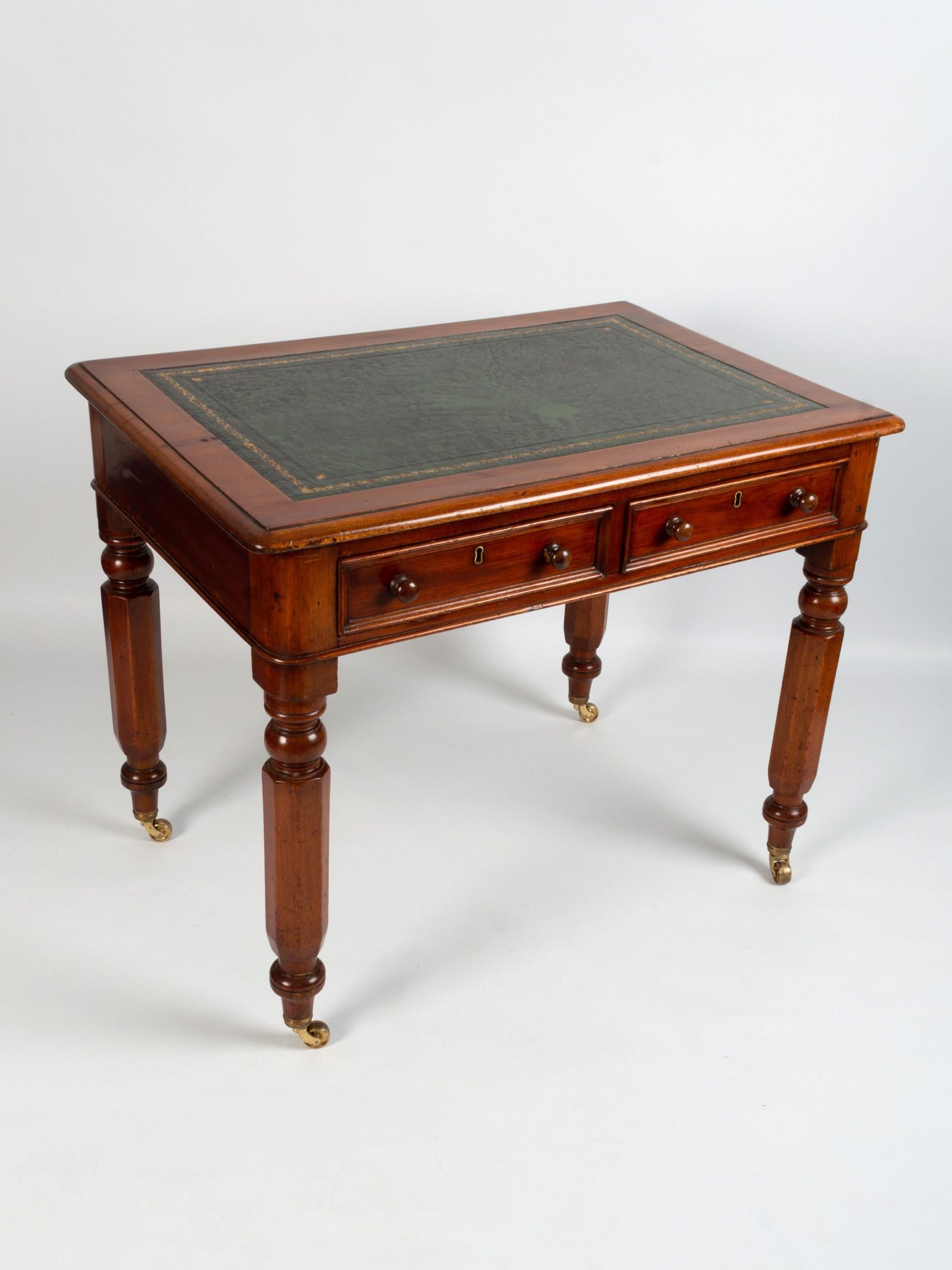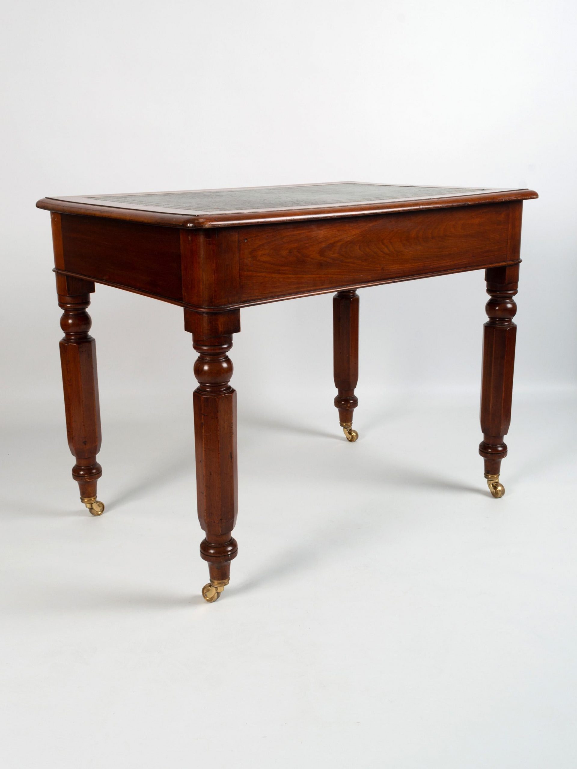 Antique 19th century English Mahogany and leather inset library table C.1840. A neatly proportioned library desk with two drawers, standing on beautifully turned legs, terminating in brass castors. This early Victorian example is presented in excellent condition commensurate of age.
