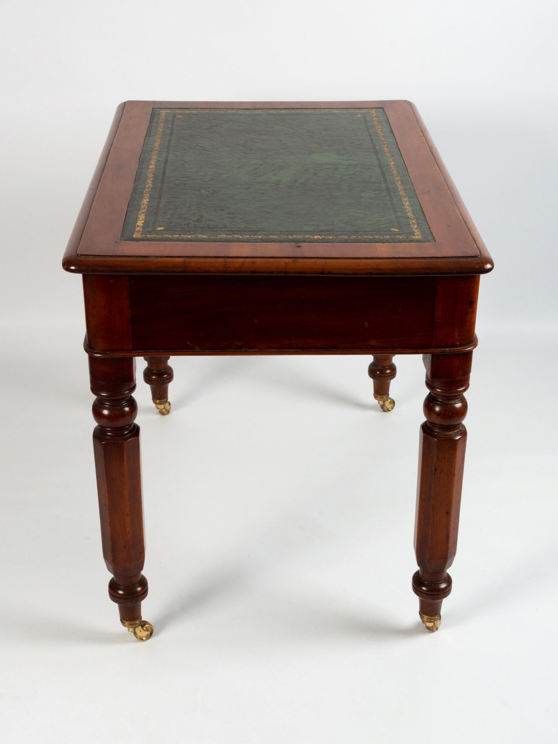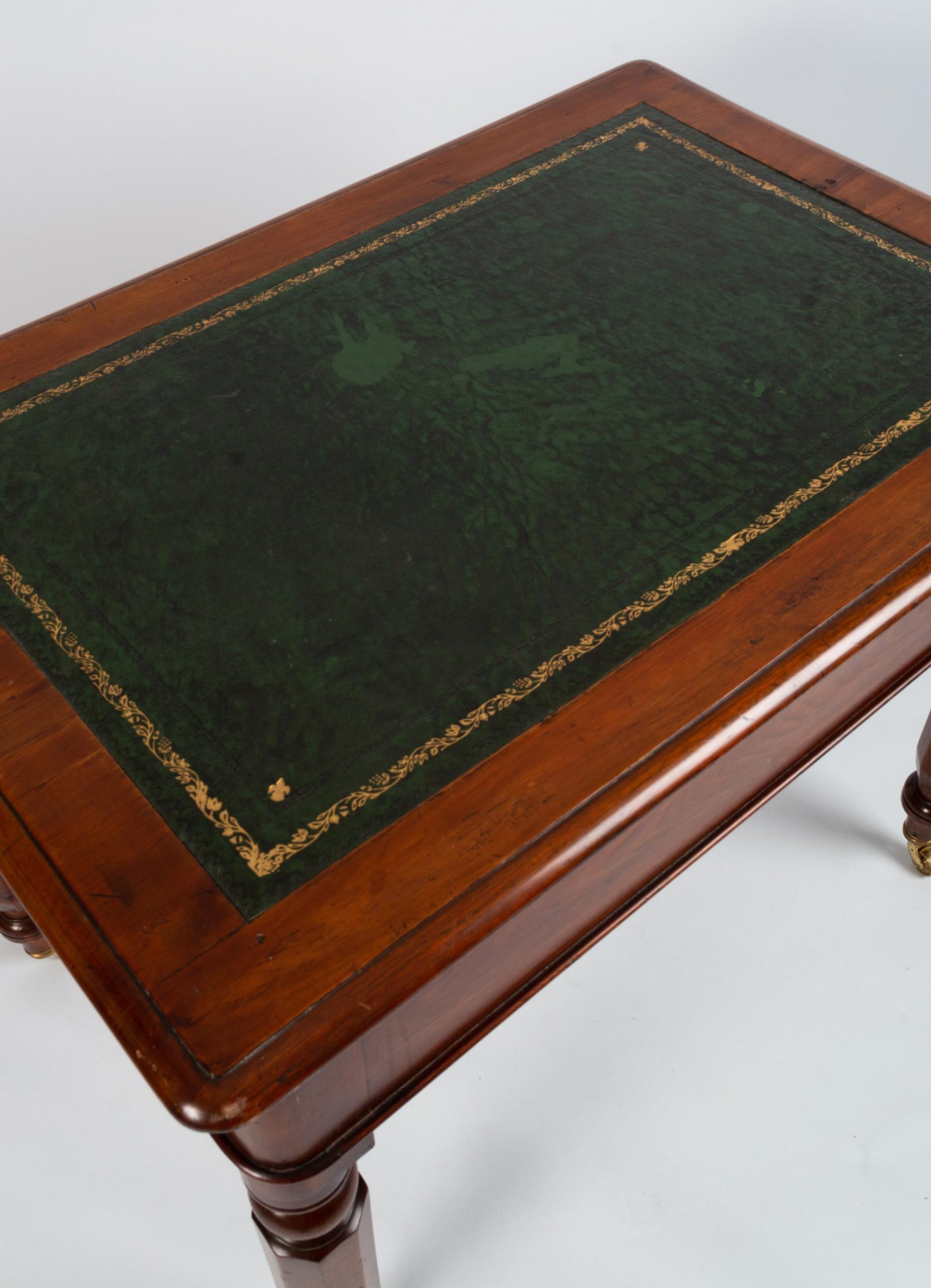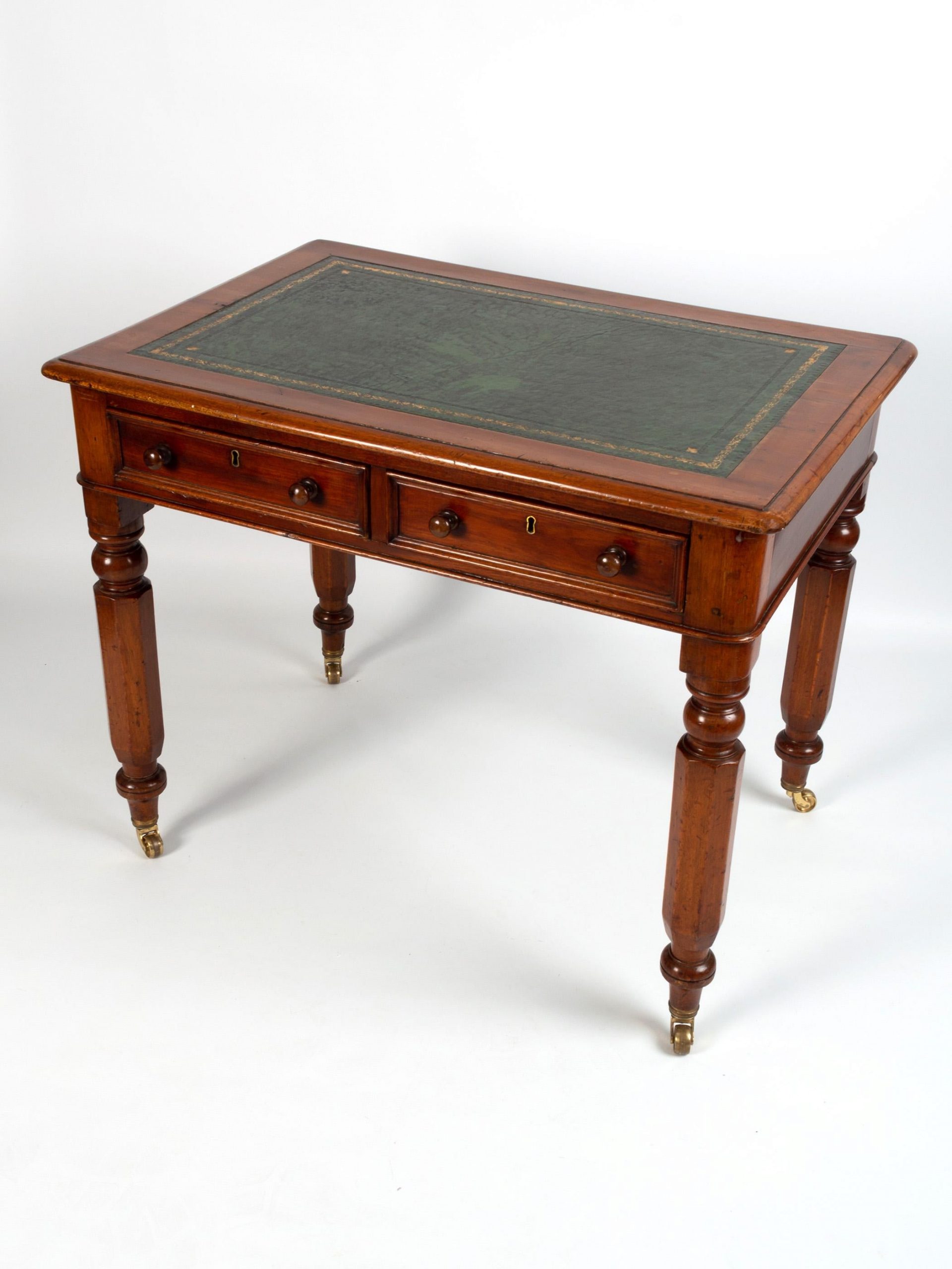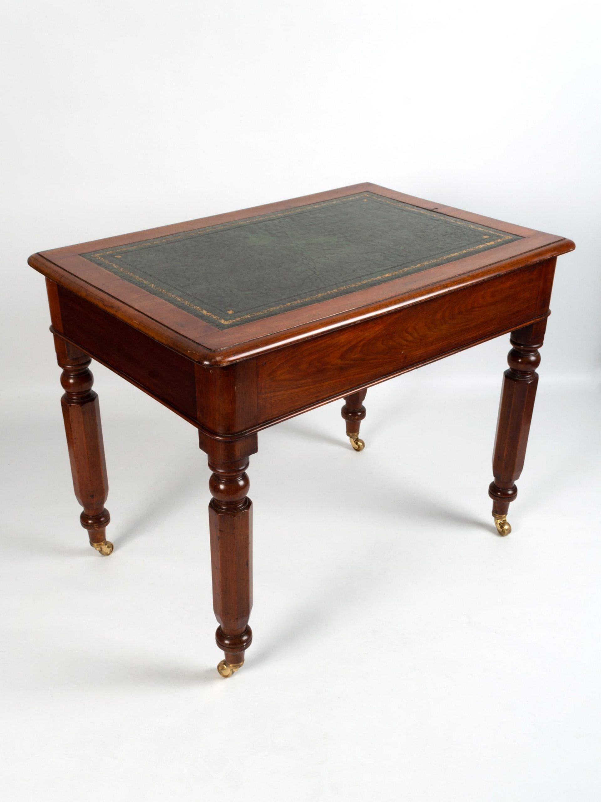 Antique 19th century English Mahogany and leather inset library table C.1840. A neatly proportioned library desk with two drawers, standing on beautifully turned legs, terminating in brass castors. This early Victorian example is presented in excellent condition commensurate of age.
