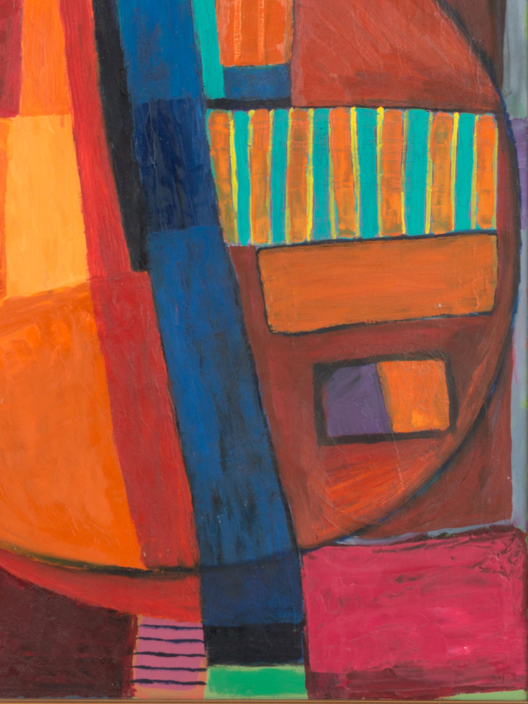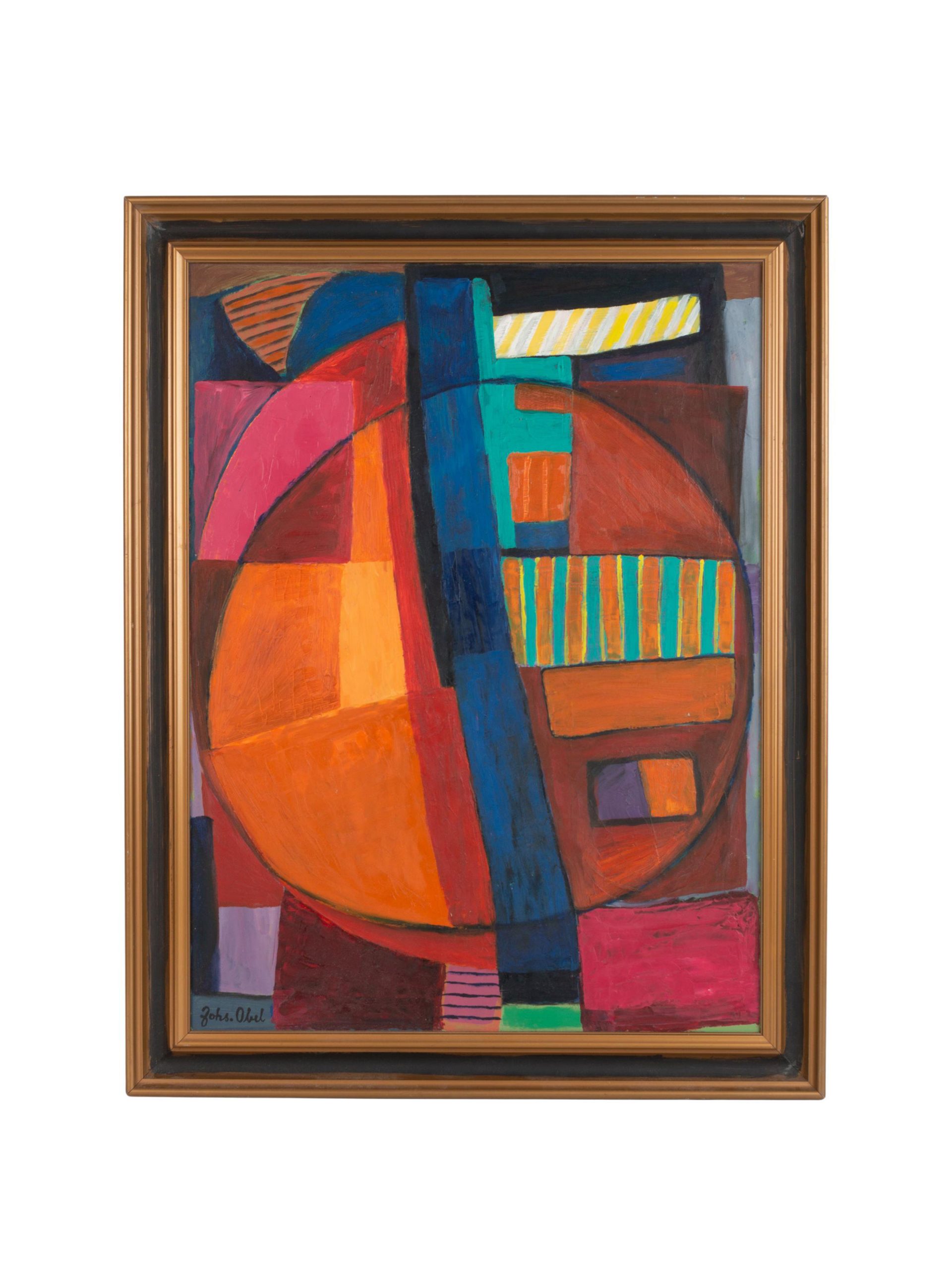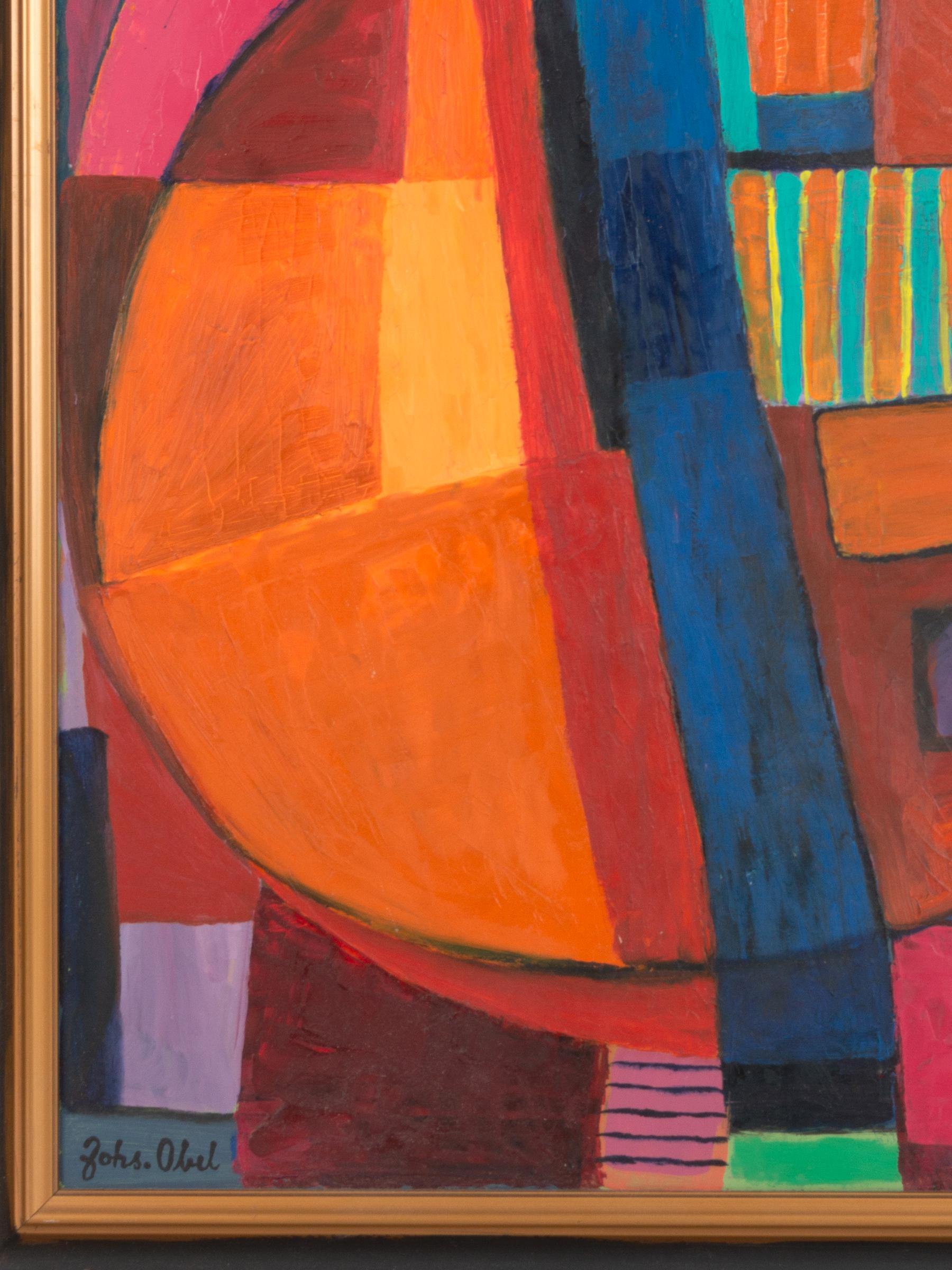 Original signed Mid-Century Modern 1950s oil on board untitled geometric abstraction. Framed oil on board by Danish Artist Johannes Obel (b. 1932). Provenance: London Collection. In excellent vintage condition, good colour and vibrancy.