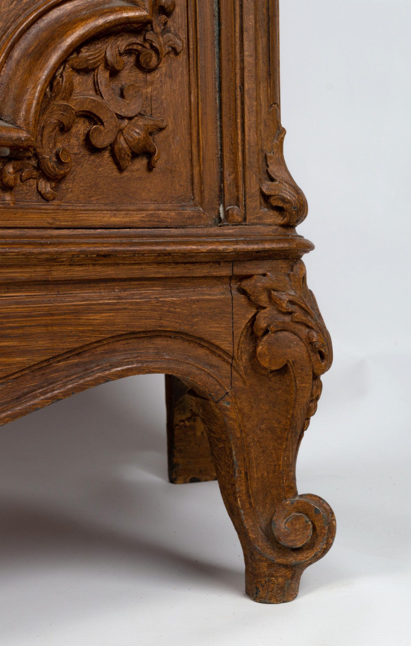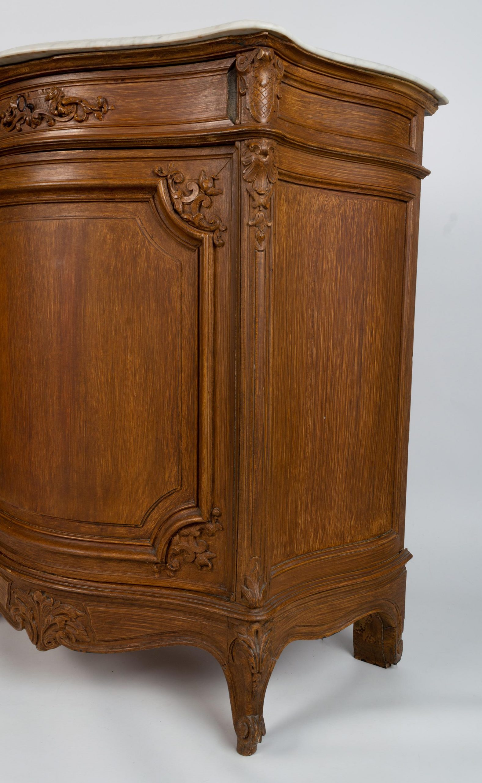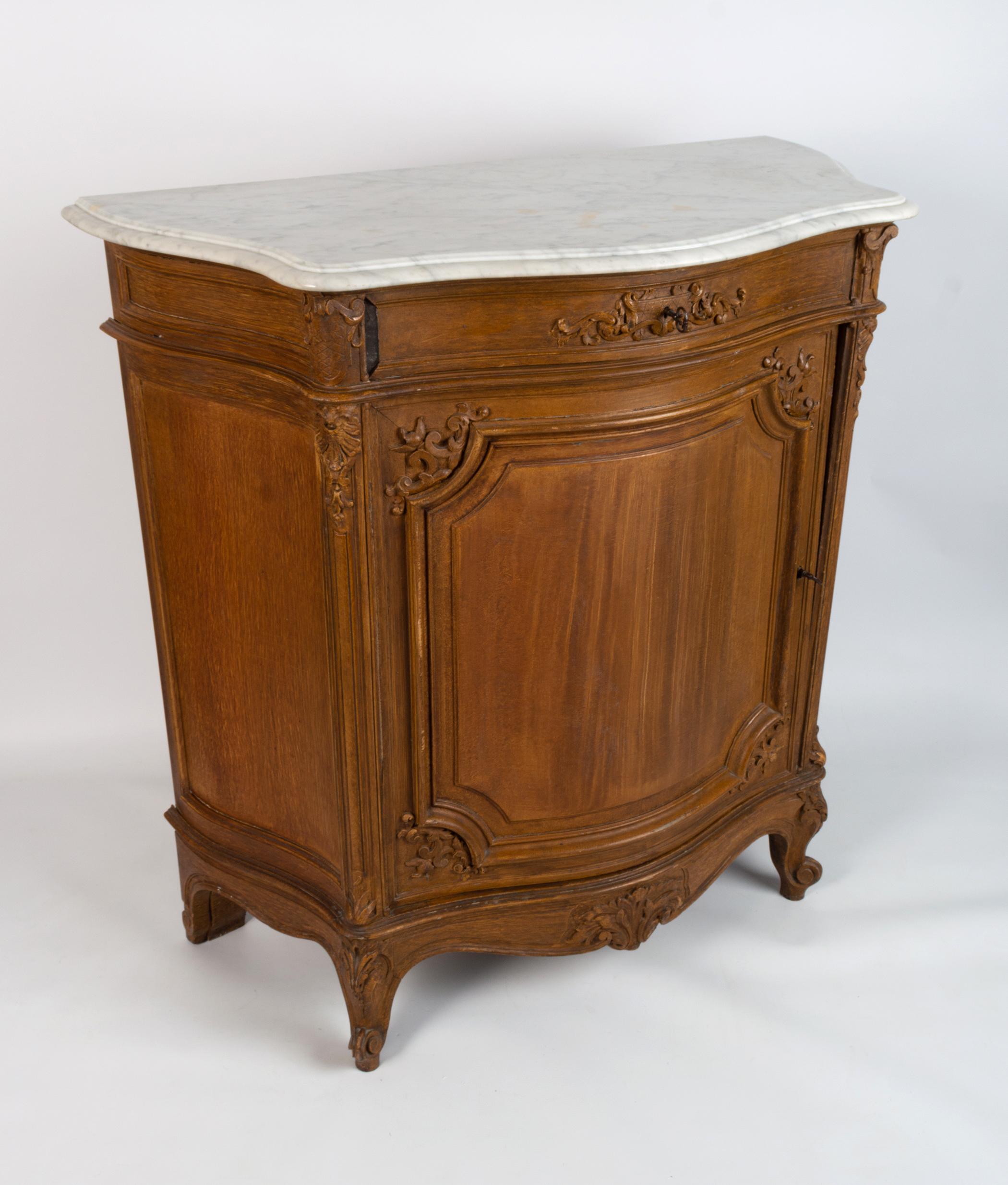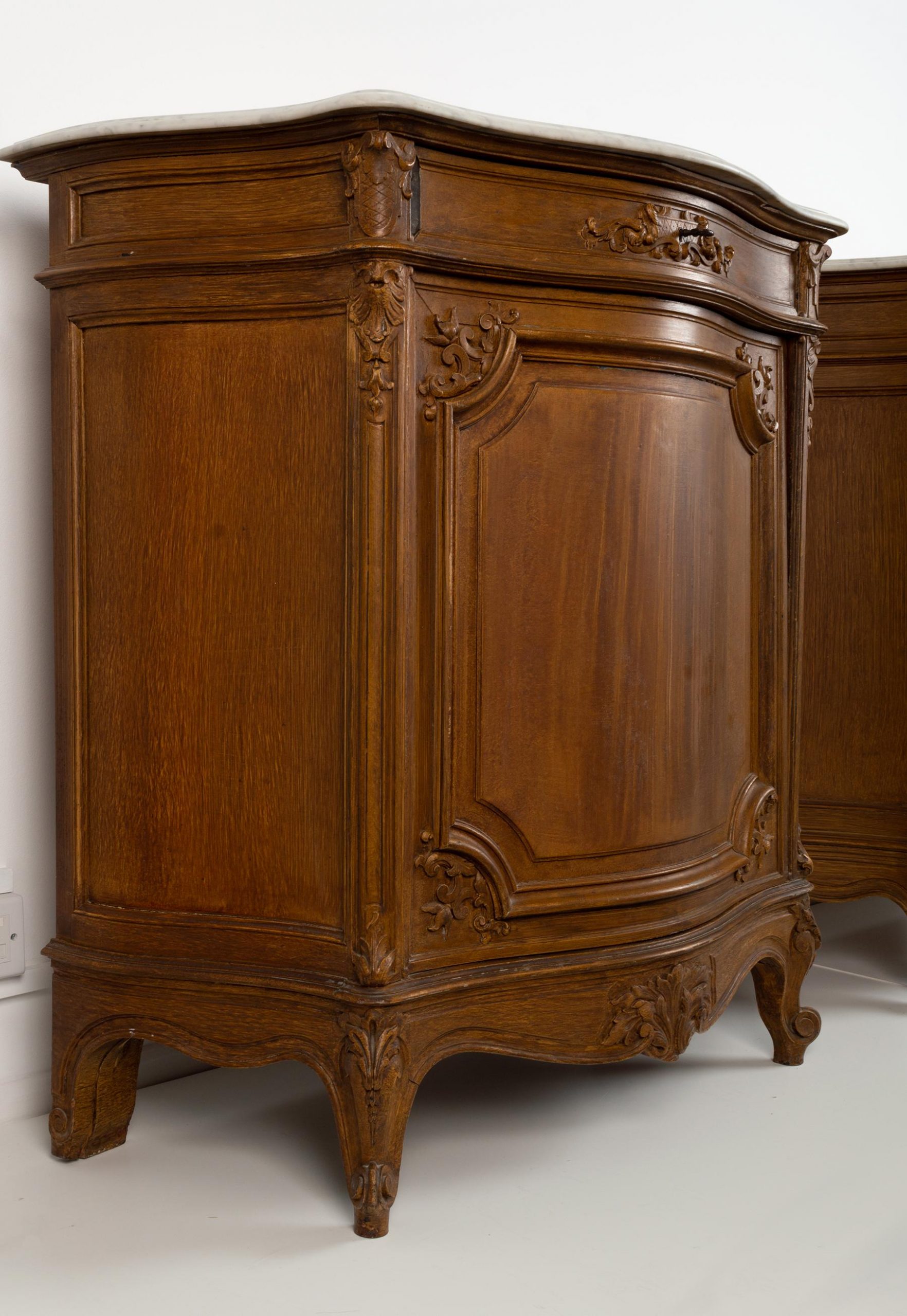 Each with a marble top above a frieze of one short drawer above a central door, the surfaces with scrub painted panelling and carved detailing, all terminating in escargot legs.