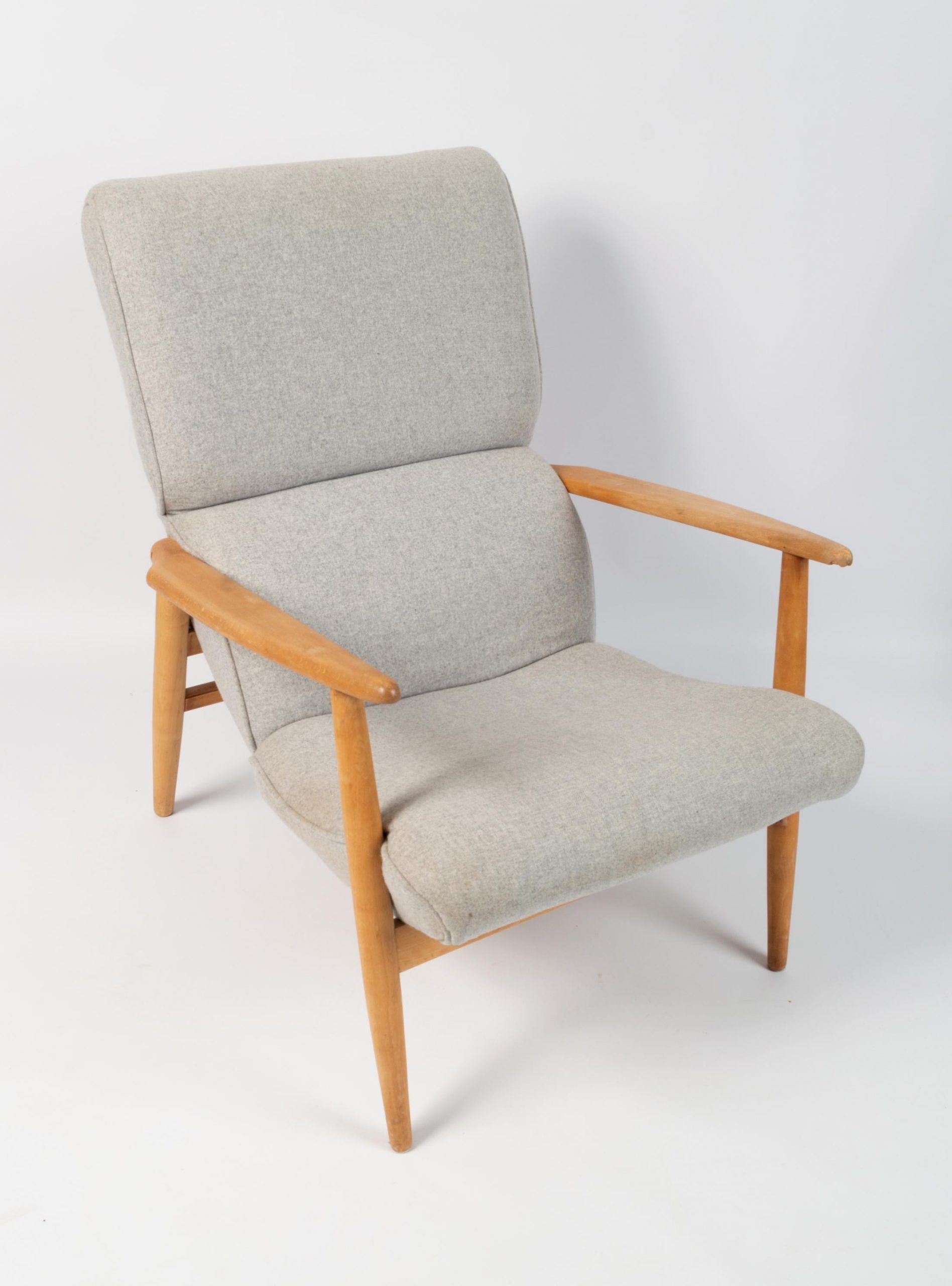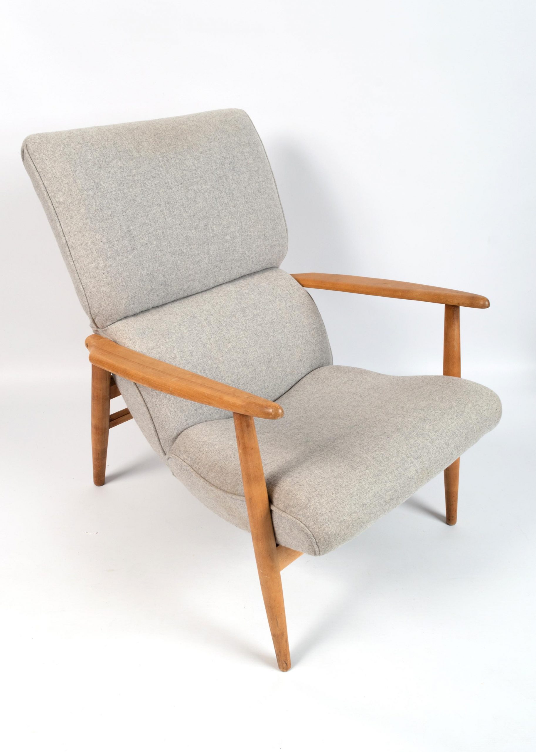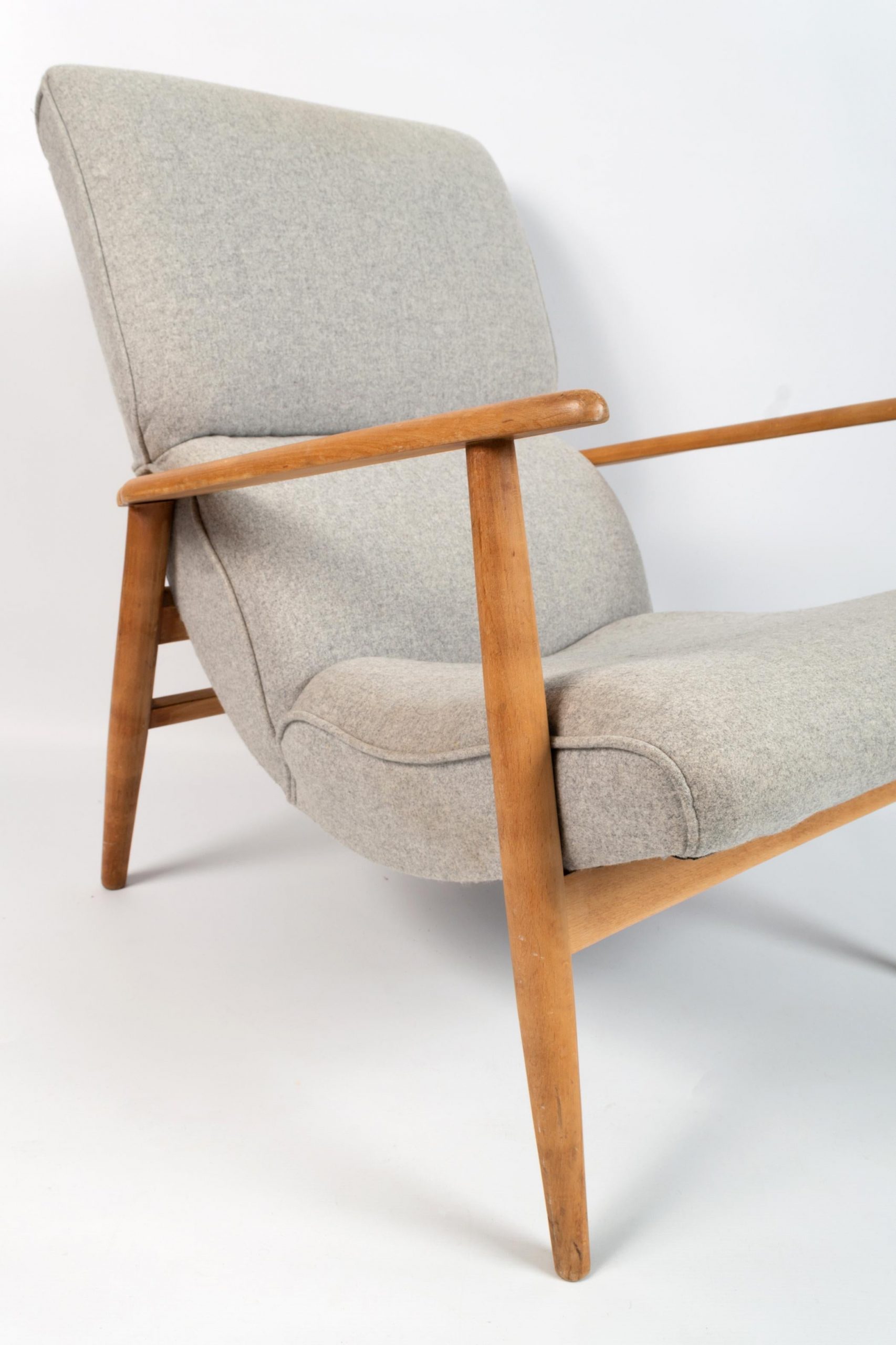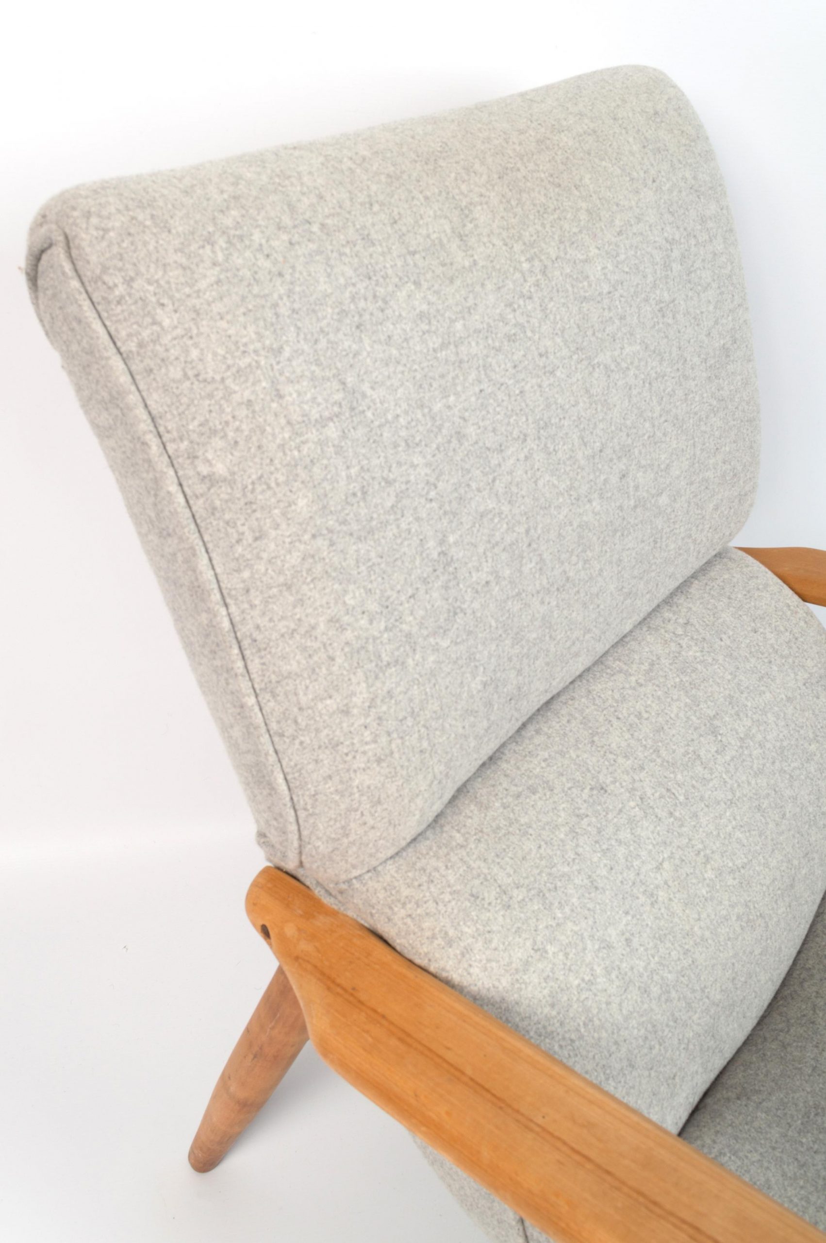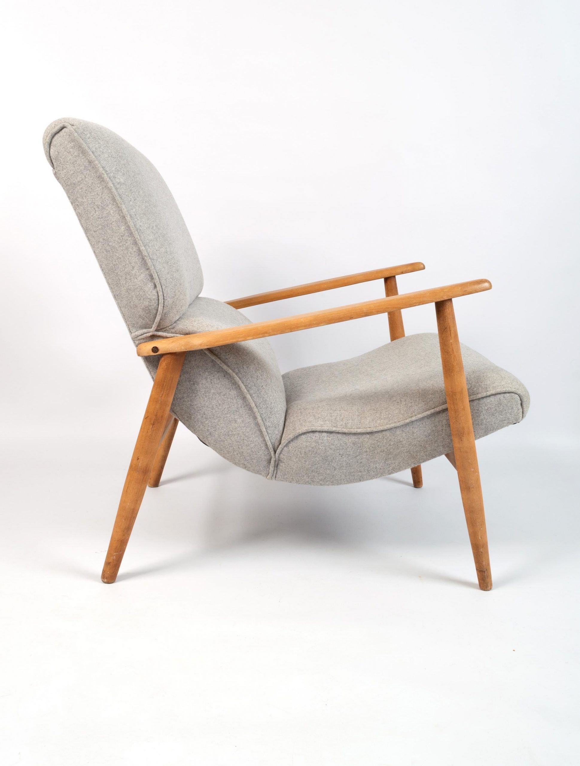 Constructed in a beech frame and upholstered in a classic mid-century grey wool fabric.