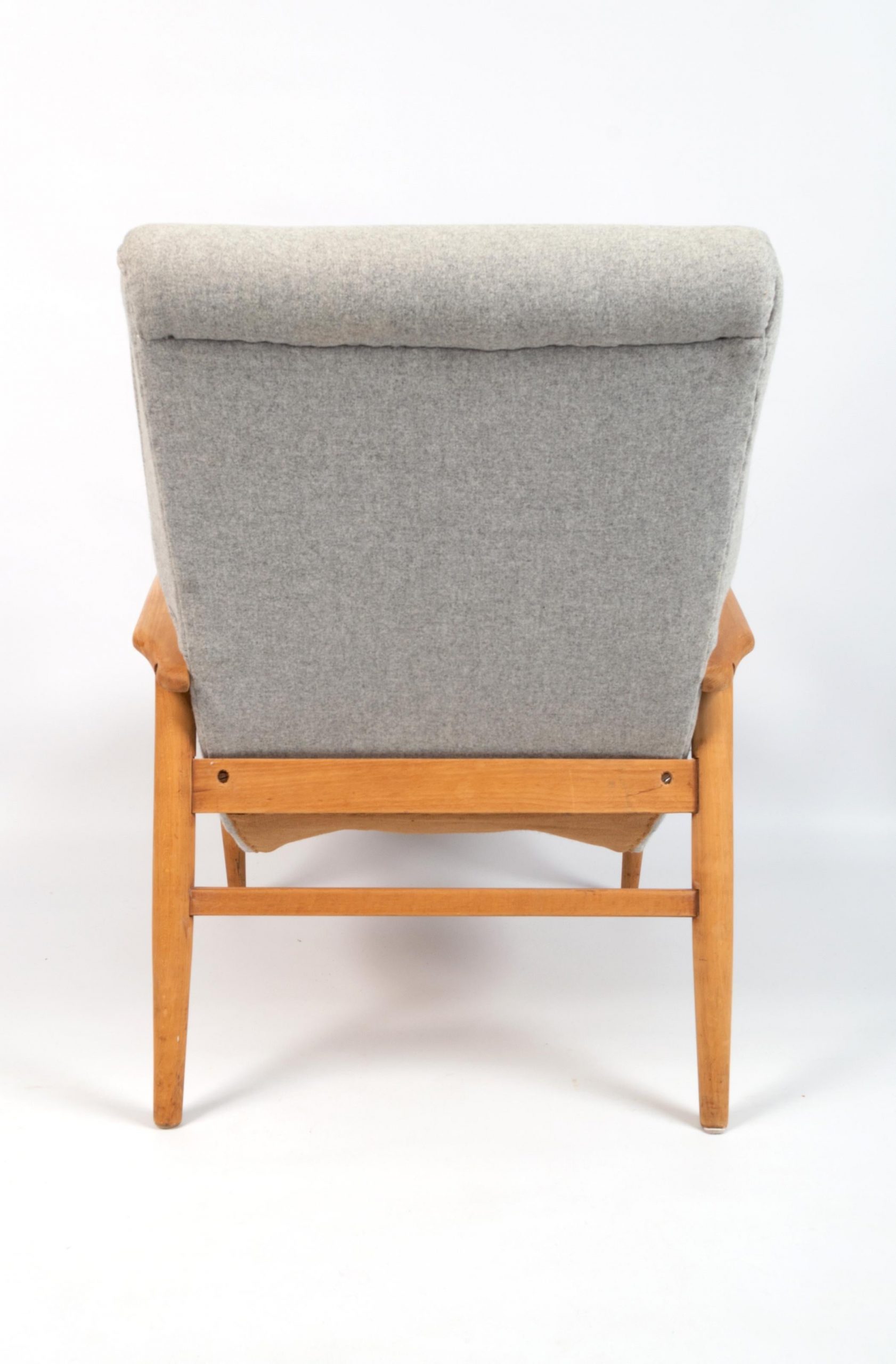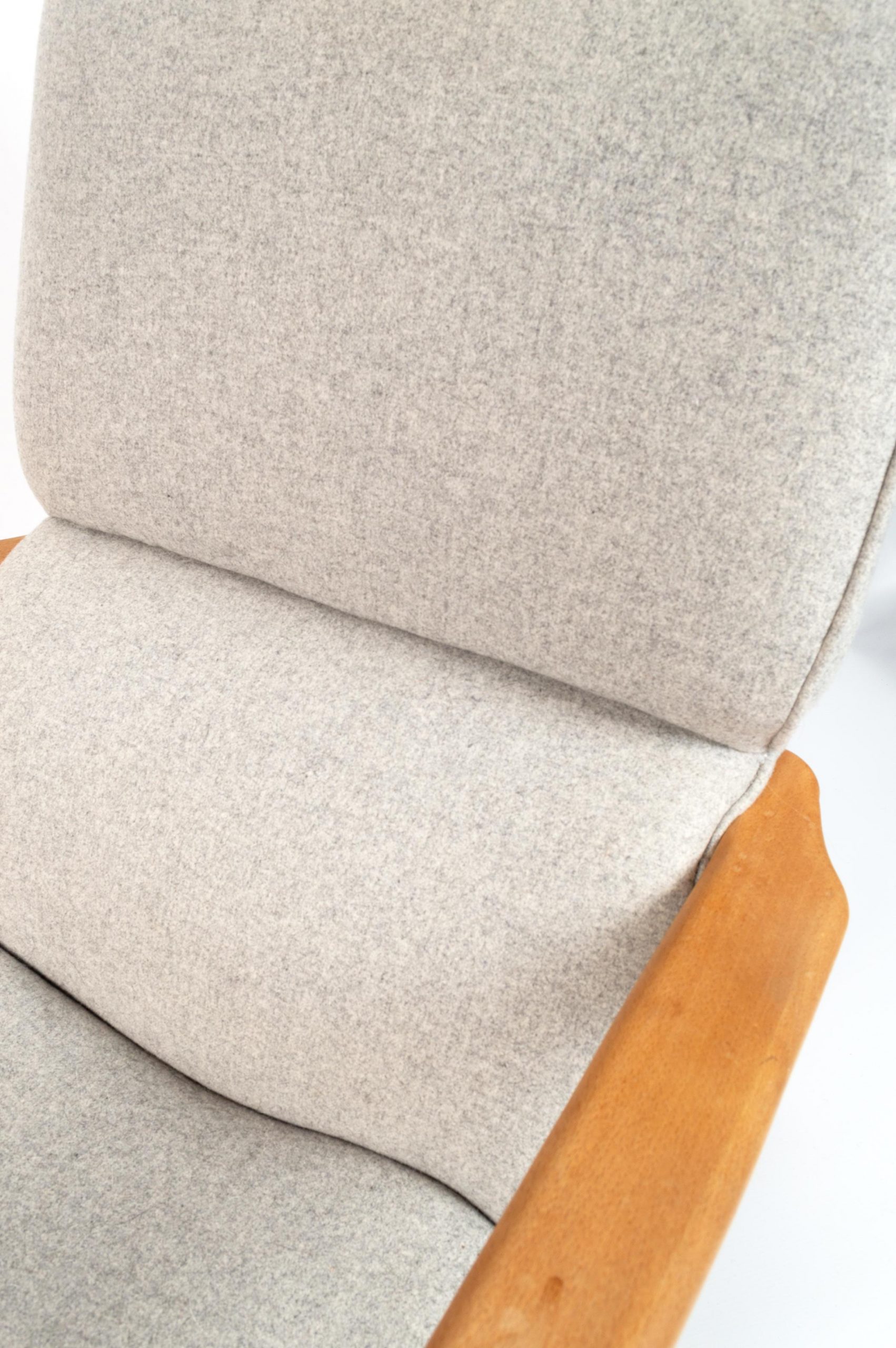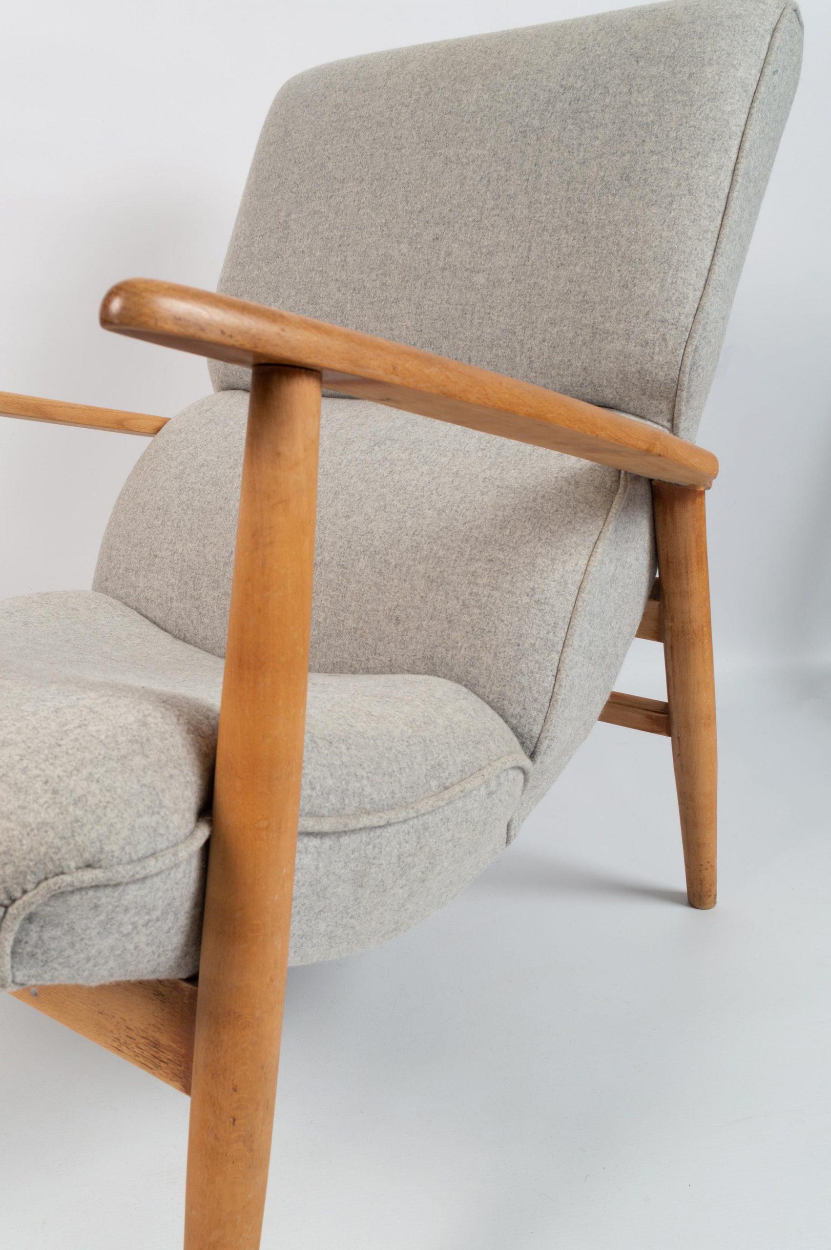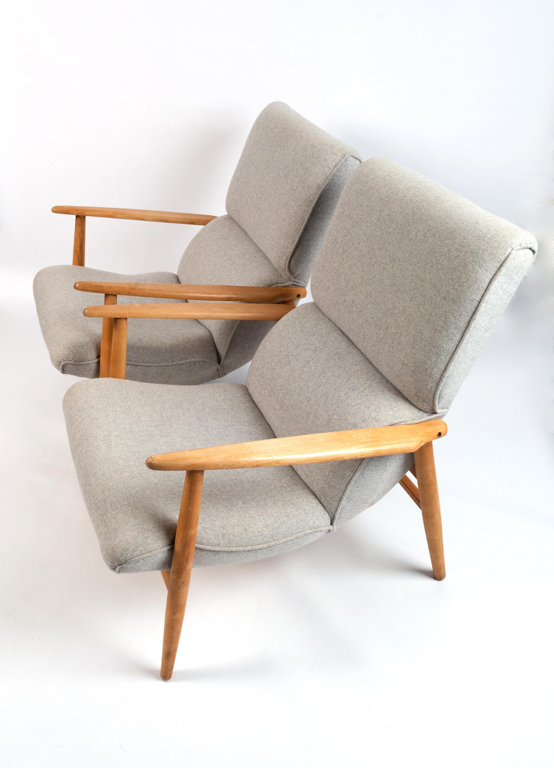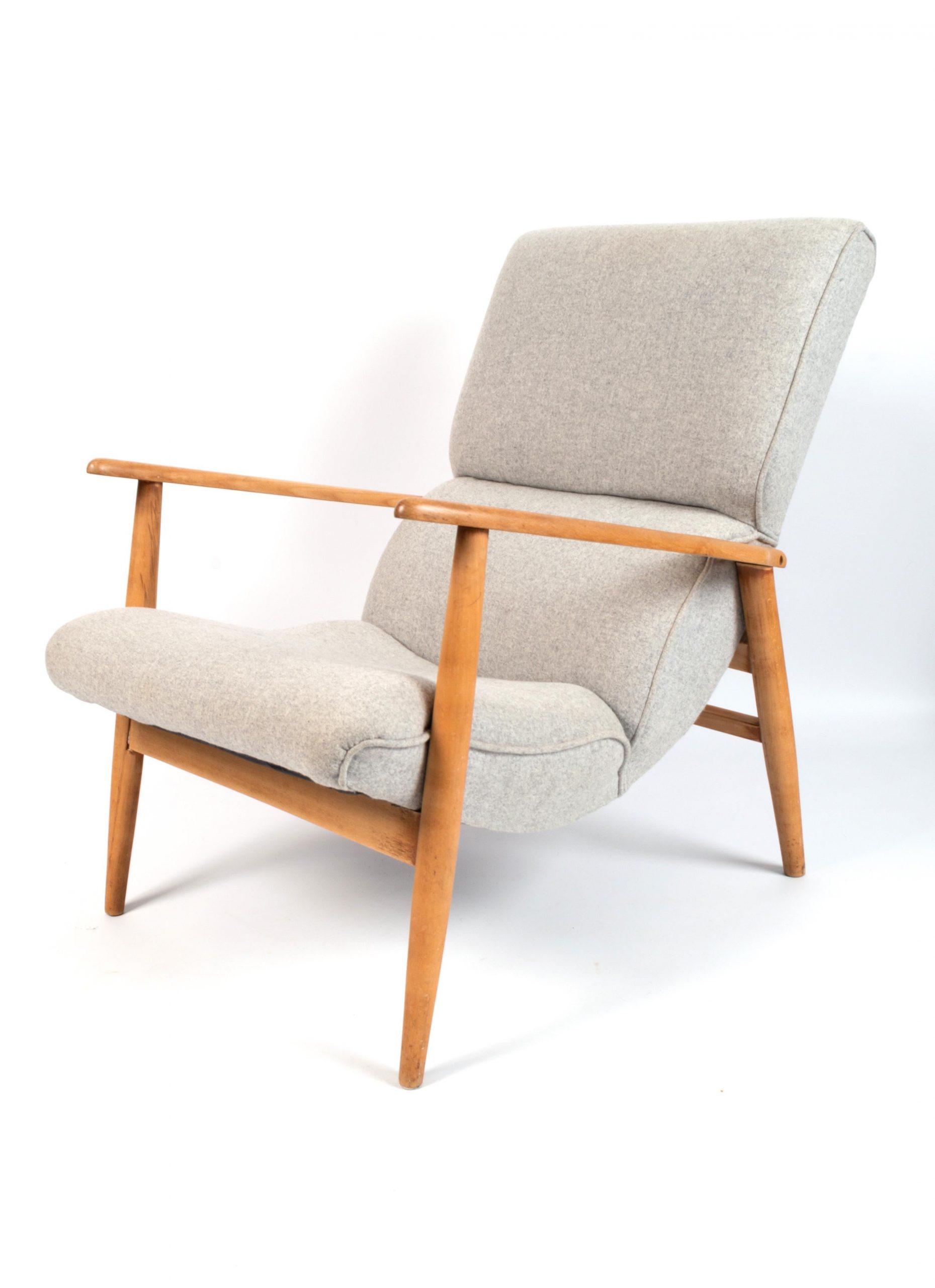 Constructed in a beech frame and upholstered in a classic mid-century grey wool fabric.